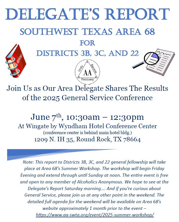 This report to Districts 3B, 3C, and 22 general fellowship will take place at Area 68's Summer Workshop Saturday Morning of the Workshop!